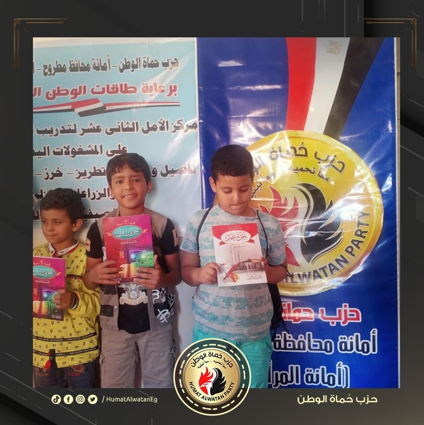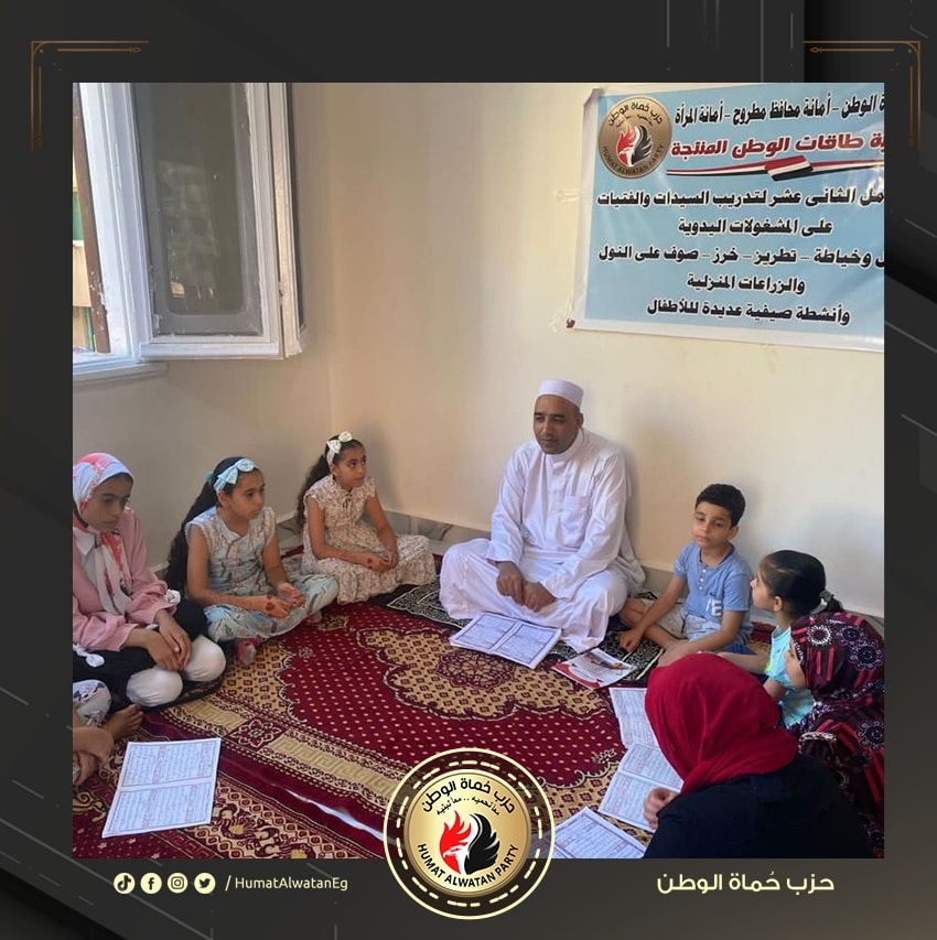 تواصل أمانة محافظة مطروح بحزب حماة الوطن، تنظيم حلقات ودروس القرآن الكريم للأطفال والفتيات بمركز الأمل ١٢، ويأتي استكمالًا لمبادرة طاقات الوطن المنتجة التي اطلقها حزب حماة الوطن.