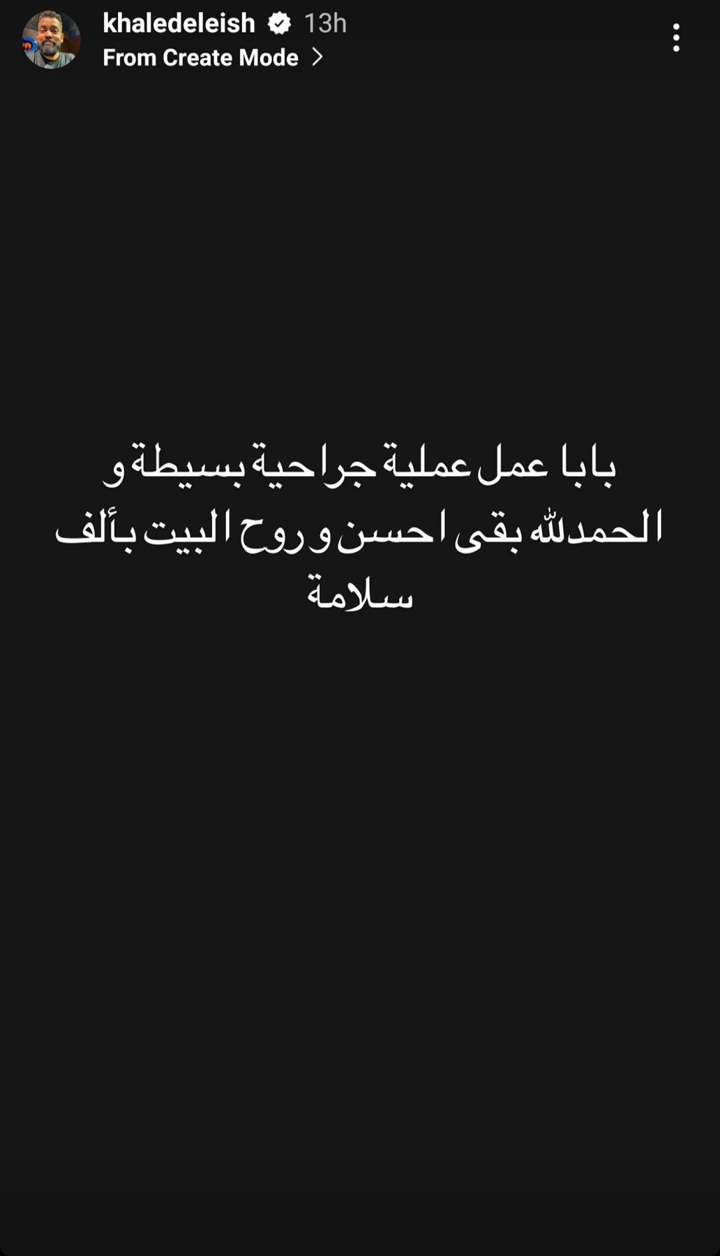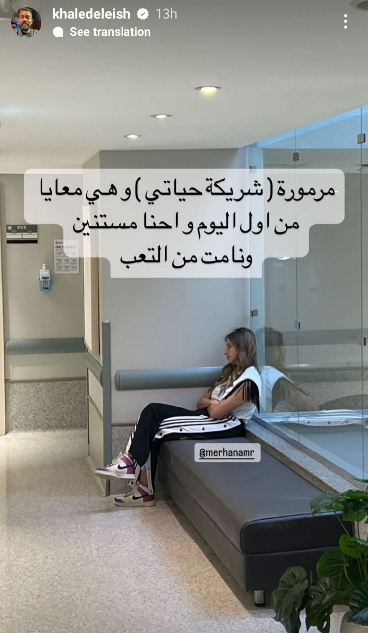 وكتب خالد عليش من خلال خاصية إستوري: بابا عمل عملية جراحية بسيطة.. والحمد لله بقى أحسن وروح البيت.. ومرمورة شريكة حياتي معايا من أول يوم ونامت من التعب.