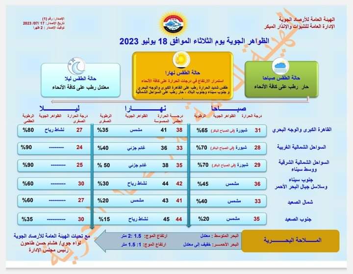 وأشار أن درجات الحرارة العظمي اليوم الثلاثاء تصل إلي 38 درجة في القاهرة ، و44 على الصعيد، متوقعا أن تنخفض درجات الحرارة خلال يومي الجمعة والسبت انخفاض طفيف درجة أو درجتين إلا أنه غير ملموس، ثم تعود درجات الحرارة الارتفاع مرة أخرى يوم الأحد لتصل إلي 38 درجة مئوية.