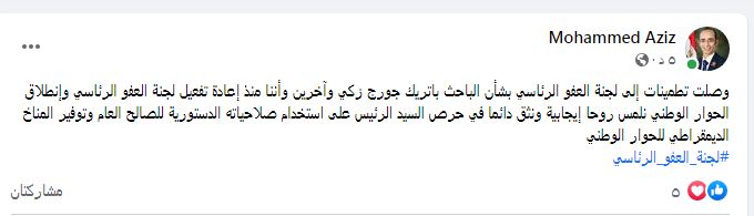 وأعلن ضياء رشوان المنسق العام للحوار الوطني، آن مجلس أمناء الحوار قد أصدر بيانا يناشد فيه السيد رئيس الجمهورية، باستخدام صلاحياته القانونية والدستورية نحو الافراج الفوري عن الناشط الحقوقي باتريك جورج زكي، وعدم تنفيذ العقوبة المقضي بها اليوم ضده، مع دعوة السيد الرئيس لاستخدام حقه الدستوري في العفو عن باقي العقوبة إذا تطلب الامر.