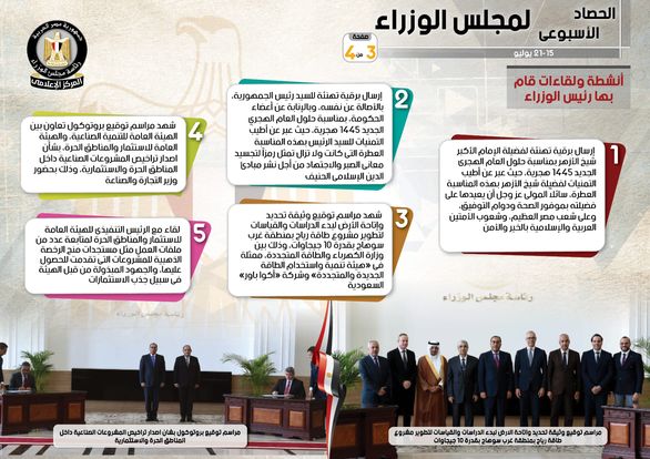 نشر المركز الإعلامي لمجلس الوزراء، تقريراً شمل إنفوجرافات سلط من خلالها الضوء على الحصاد الأسبوعي لمجلس الوزراء، وذلك خلال الفترة من 15حتى 21 يوليو 2023، والذي تضمن الموافقة على عدد من القرارات، فضلاً عن الاجتماعات واللقاءات التي عقدها الدكتور مصطفى مدبولي، رئيس مجلس الوزراء، بالإضافة إلى ما قام به سيادته من أنشطة.