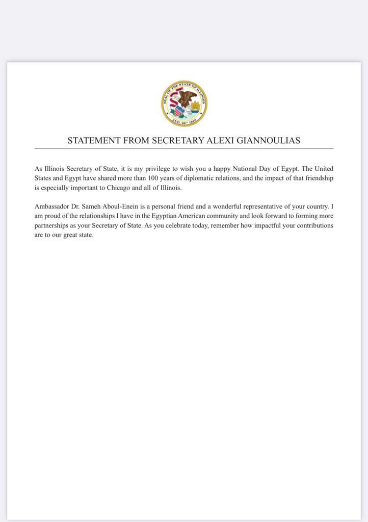 أصدرت ولاية الينوي فى الولايات المتحدة الامريكية بيان تهنئة للمرة الأولى بمناسبة العيد القومى لجمهورية مصر العربية.