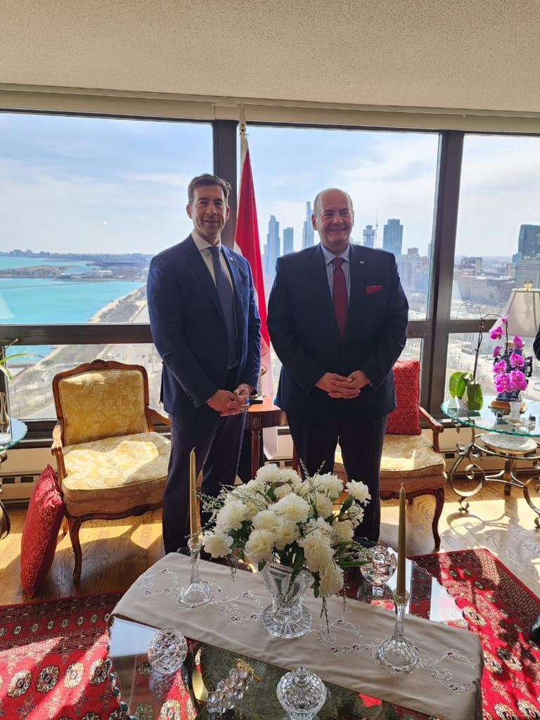 وتلقى الدكتور السفير سامح أبو العينين، قنصل عام مصر فى شيكاغو خطاب التهنئة بالعيد القومى ومئوية العلاقات المصرية الأمريكية وقد خص البيان الرسمي بالتقدير للدكتور سامح أبوالعينين للأداء والتمثيل الدبلوماسي المشرف لمصر ولمكانتها في وسط الغرب الامريكي ،مشيدا بعلاقات الصداقه القويهً التي تربط المسؤليين بالولاية.