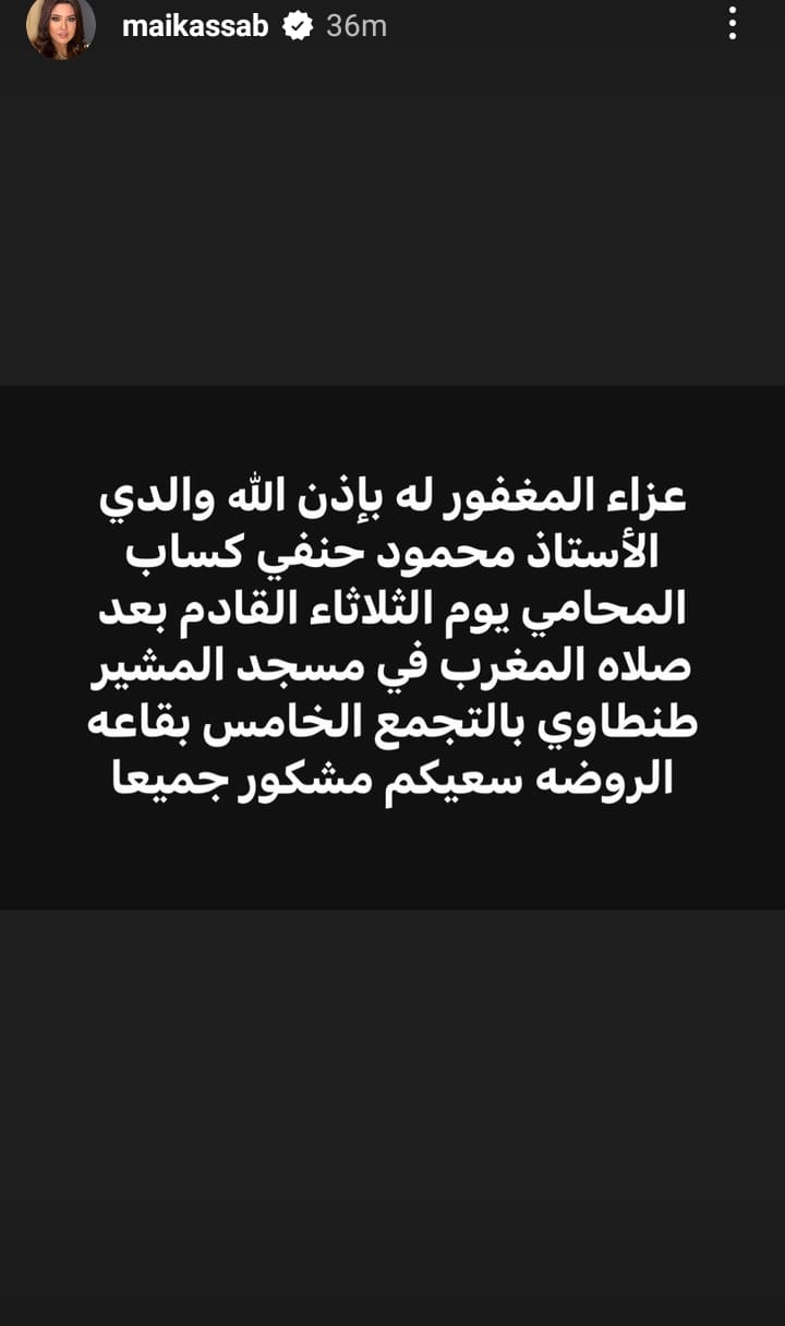 وكتبت مي كساب عبر حسابها الرسمي بموقع تبادل الصور والفيديوهات انستجرام من خلال خاصية “ستوري”: عزاء المغفور له بإذن الله والدي الأستاذ محمود حنفي كساب المحامي، يوم الثلاثاء القادم بعد صلاة المغرب من مسجد المشير طنطاوي بالتجمع الخامس بقاعة الروضة.. سعيكم مشكور جميعا.