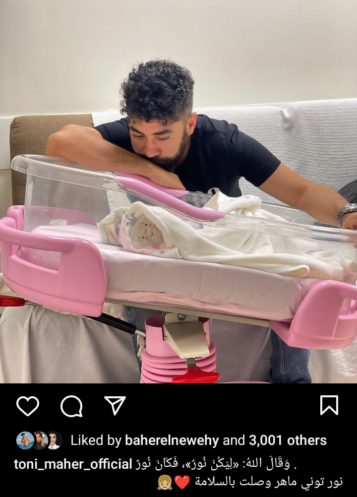 ونشر توني ماهر صورته إلى جانب طفلته عبر موقع انستجرام، وعلق عليها: وَقَالَ اللهُ: «لِيَكُنْ نُورٌ»، فَكَانَ نُورٌ . نور توني ماهر وصلت بالسلامة.