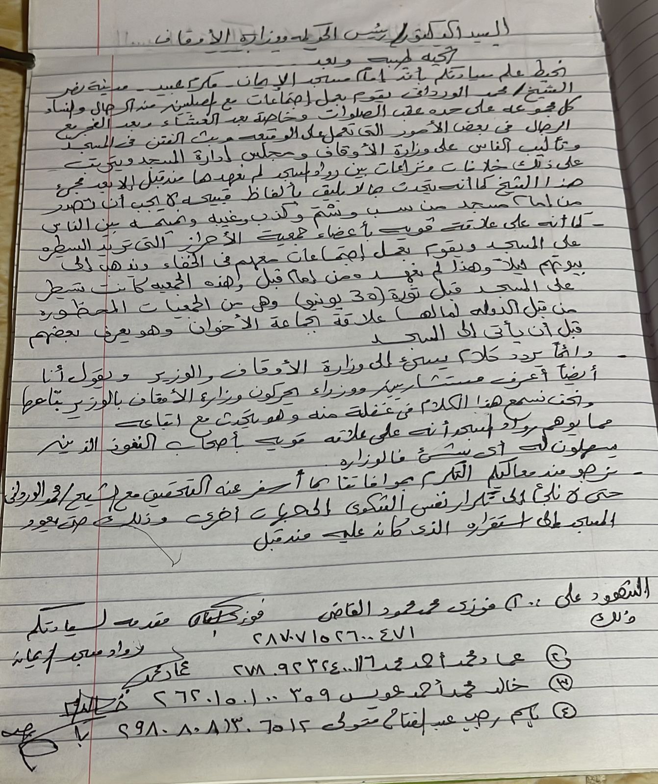 وأشارت المذكرة أنه تم تقديم عدة شكاوى من حوالي 500 من رواد المسجد بالرقم القومي لمكتب الحوكمه والتفتيش بالوزارة وكذلك وكيل وزارة القاهره ورئيس القطاع الديني دون جدوى.