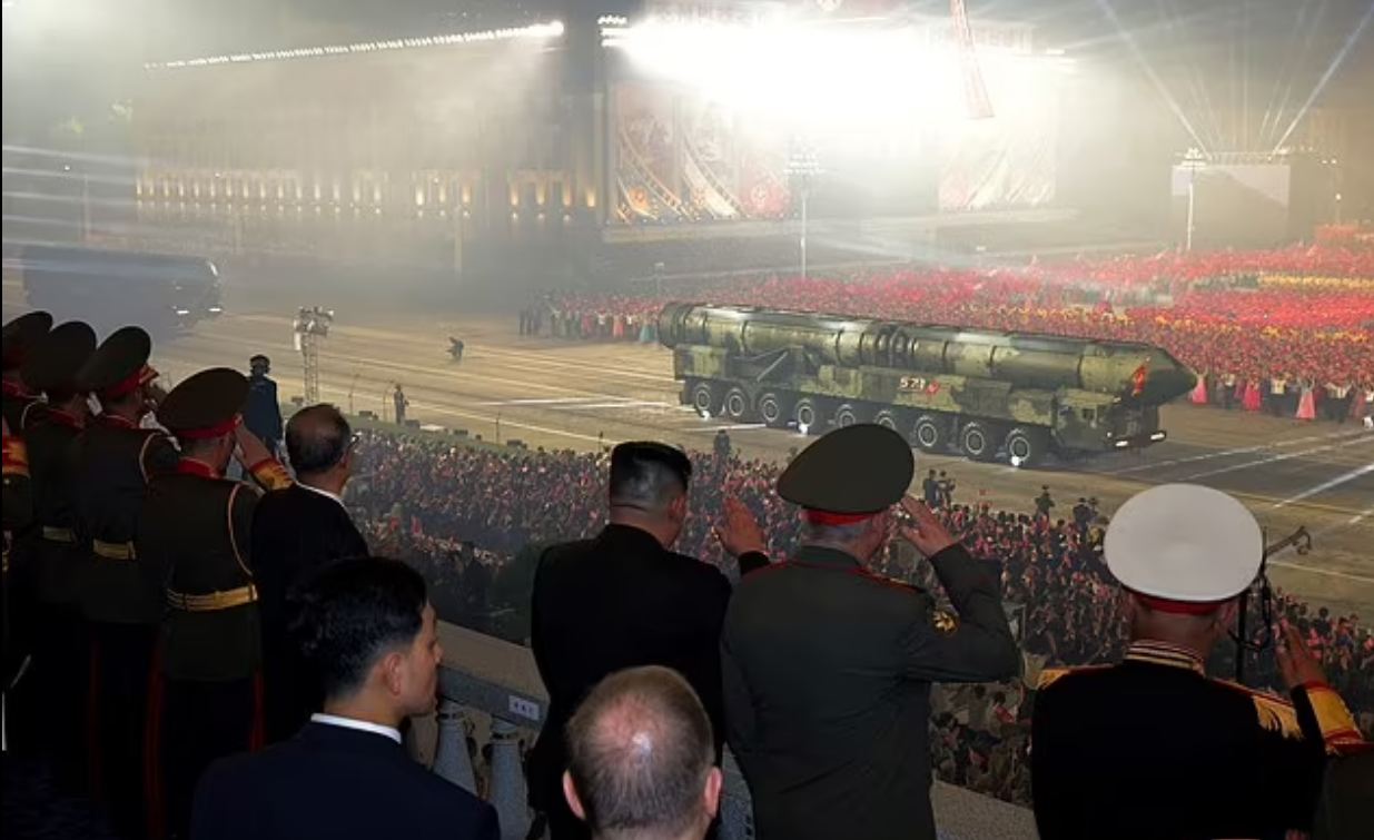 أظهرت وسائل إعلام رسمية في كوريا الشمالية اليوم الجمعة المسؤولين الروس والصينيين يقفون جنبًا إلى جنب مع "كيم جونغ أون" أثناء إستعراضهم لأحدث صواريخ كوريا الشمالية ذات القدرة النووية، والطائرات المسيرة الهجومية الجديدة في عرض عسكري في العاصمة " بيونغ يانغ".