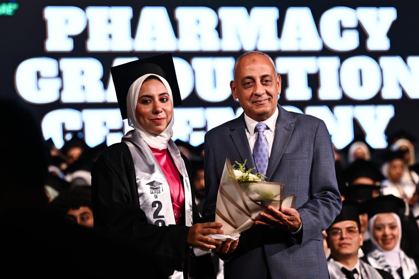 وعلى هامش الحفل كرمت جامعة مصر للعلوم والتكنولوجيا الدكتورة نجوى هاشم وكيل نقابة الصيادلة بالجيزة، والتى قامت بتلاوة القسم للخريجين وقاموا بترديد القسم ورائها.
