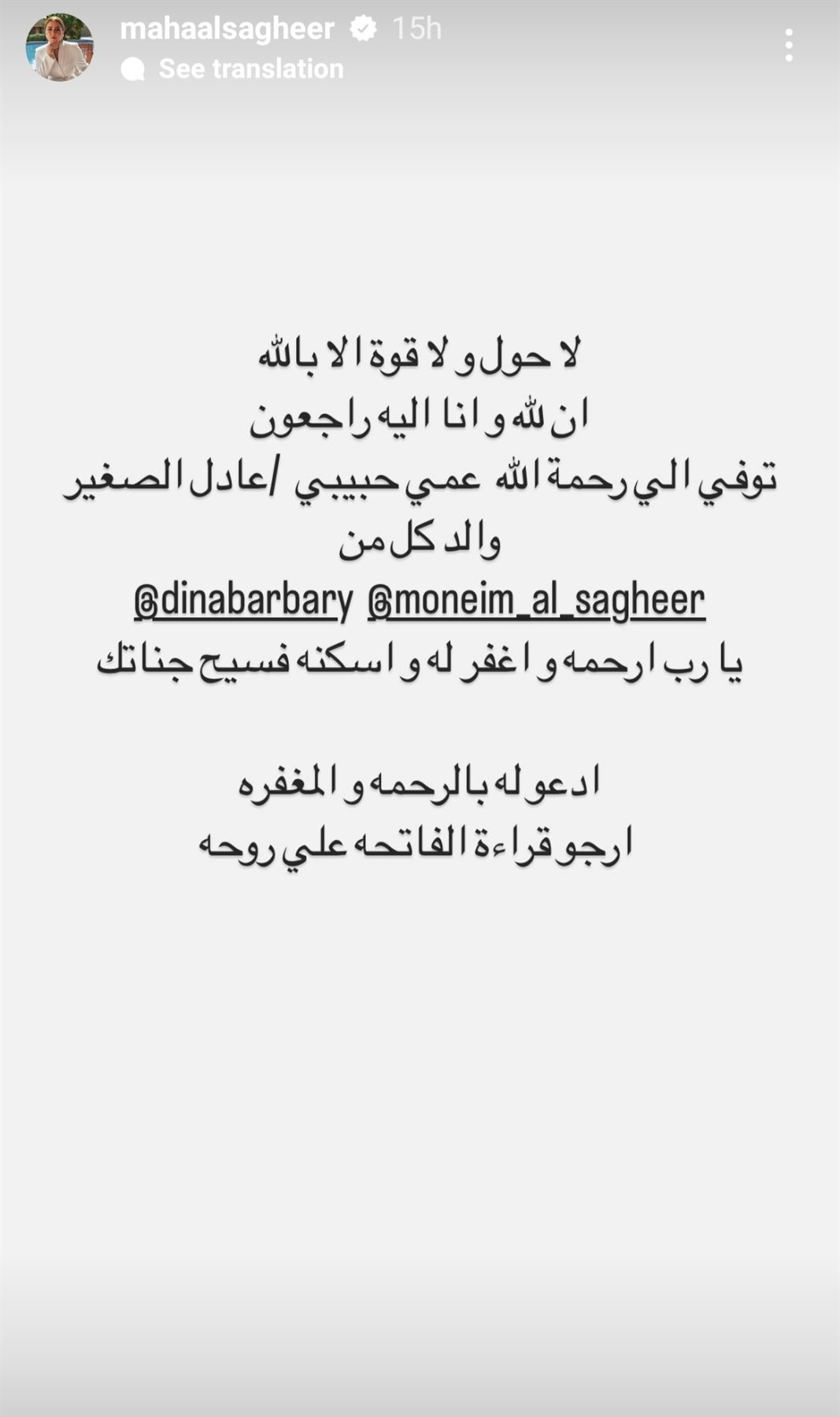 وكتبت مها الصغير من خلال خاصية استوري: لا حول ولا قوة إلا بالله.. إن لله وإن إليه راجعون، توفى إلى رحمة الله عمي حبيبي، عادل الصغير، يارب ارحمه واغفر له واسكنه فسيح جناته.