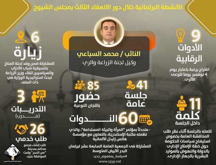 ننشر النشاط البرلماني لـ«نائب التنسيقية» محمد السباعي خلال دور الانعقاد الثالث لمجلس الشيوخ