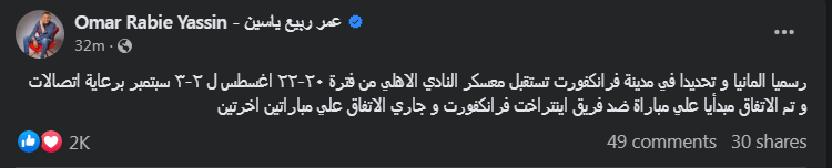 وكتب الإعلامي عمر ربيع ياسين عبر حسابة الرسمي"فيسبوك":" رسميا المانيا و تحديدا في مدينة فرانكفورت تستقبل معسكر النادي الـهلي من فترة ٢٠-٢٢ اغسطس ل ٢-٣ سبتمبر برعاية اتصالات و تم الاتفاق مبدأيا علي مباراة ضد فريق اينتراخت فرانكفورت، وجاري الاتفاق علي مباراتين اخرتين.