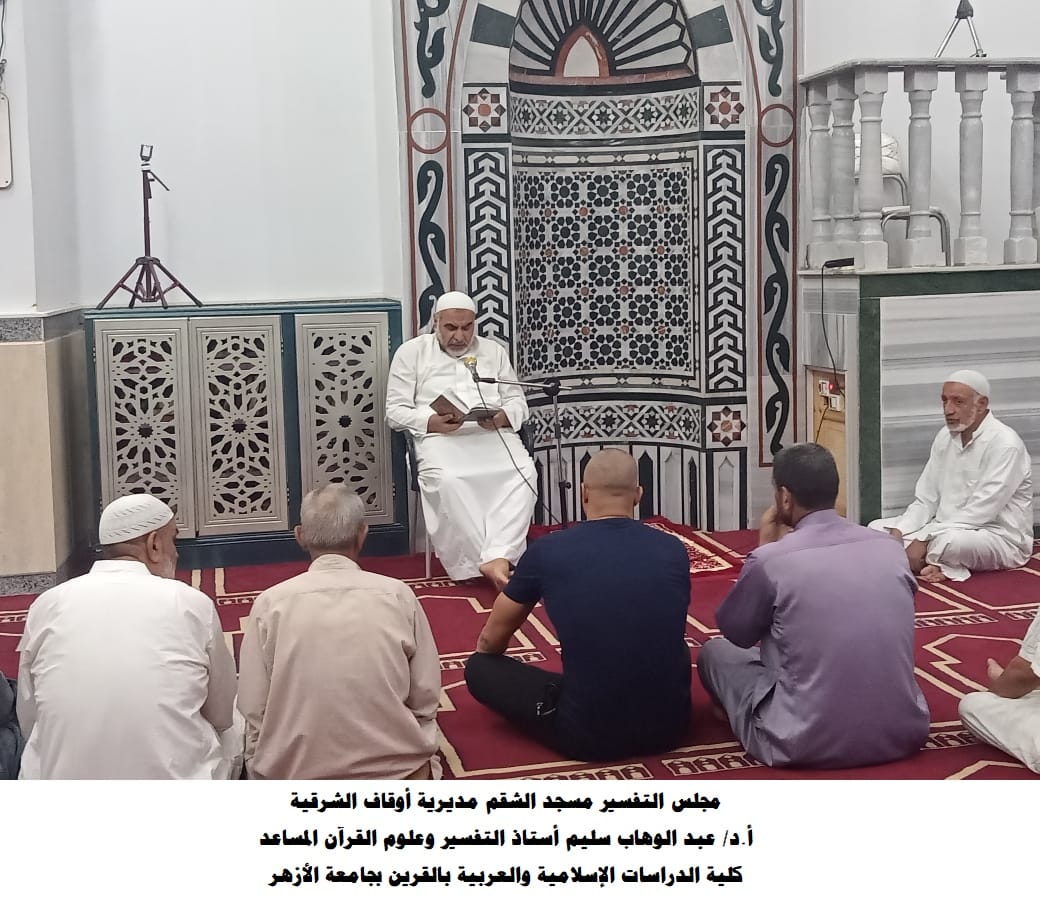 وفي مديرية أوقاف الشرقية أقيمت فعاليات مجلس التفسير بمسجد الشقم بمدينة القرين، حاضر فيه الأستاذ الدكتور عبد الوهاب سليم أستاذ التفسير وعلوم القرآن المساعد بجامعة الأزهر كلية الدراسات الإسلامية والعربية بالقرين شرقية.