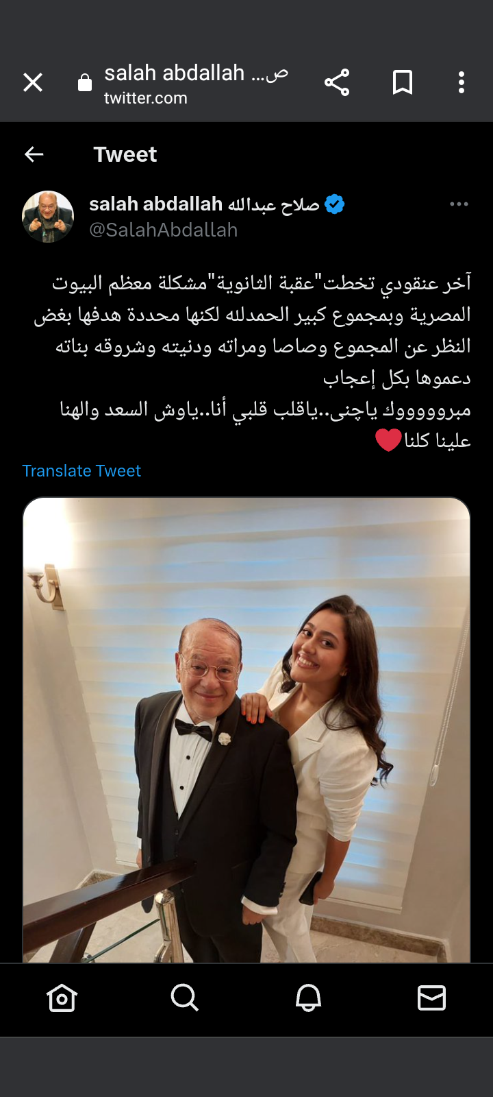 وكتب صلاح عبد الله عبر حسابها الرسمي بموقع تويتر: آخر عنقودي تخطت"عقبة الثانوية"مشكلة معظم البيوت المصرية وبمجموع كبير الحمدلله لكنها محددة هدفها بغض النظر عن المجموع وصاصا ومراته ودنيته وشروقه بناته دعموها بكل إعجاب، مبروك ياچنى..ياقلب قلبي أنا..ياوش السعد والهنا علينا كلنا.