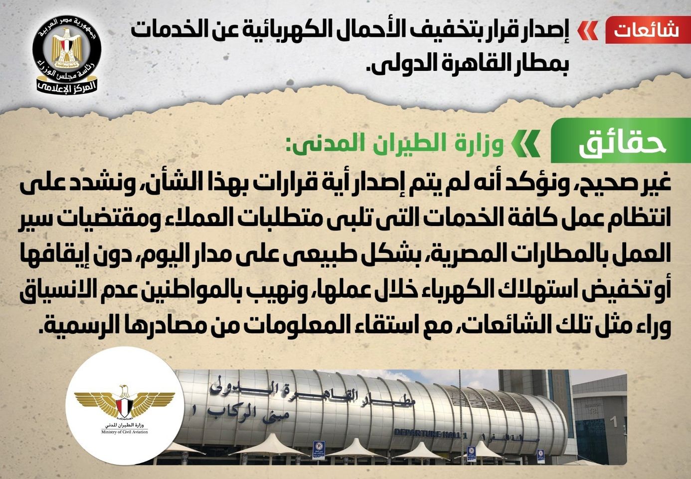 وقد قام المركز الإعلامي لمجلس الوزراء بالتواصل مع وزارة الطيران المدني، والتي نفت تلك الأنباء، مُؤكدةً أنه لا صحة لتخفيف الأحمال الكهربائية عن أي من الخدمات بمطار القاهرة الدولي، وأنه لم يتم إصدار أية قرارات بهذا الشأن.
