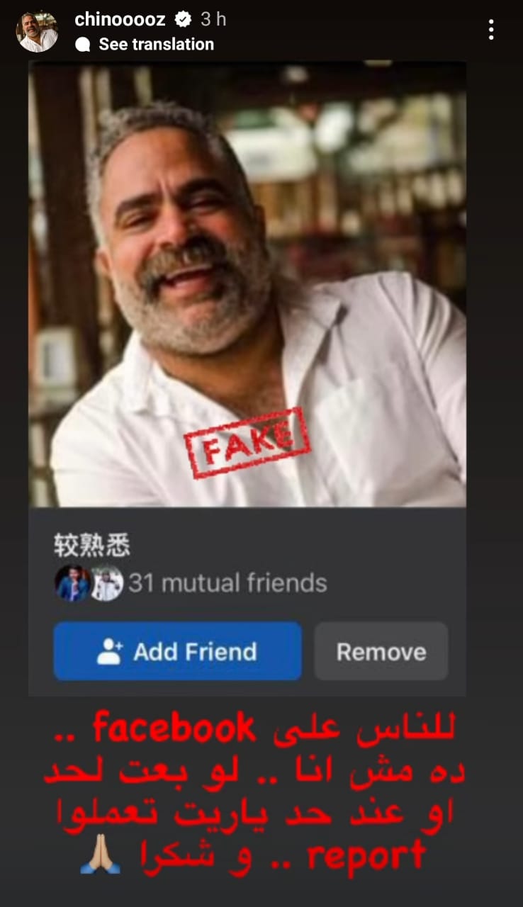 ونشر محمد شاهين عبر خاصية استوري صورة للحساب، وعلق عليها قائلًا: "للناس على فيسبوك دا مش أنا.. لو بعت لحد أو عند حد ياريت تعملوا إبلاغ.. وشكرا".