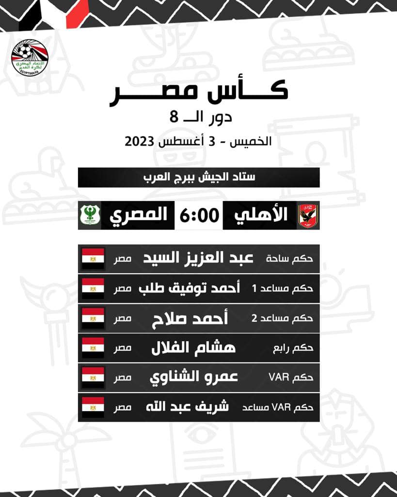 أعلنت لجنة الحكام بالاتحاد المصري لكرة القدم عن طاقم التحكيم المكلف بإدارة مباراة الأهلي والمصري البورسعيدي المقرر لها غدا الخميس في تمام الساعة السادسة مساء، والتي تجمع بين الفريقين على ستاد الجيش ببرج العرب، ضمن منافسات دور الـ8 من بطولة كأس مصر.