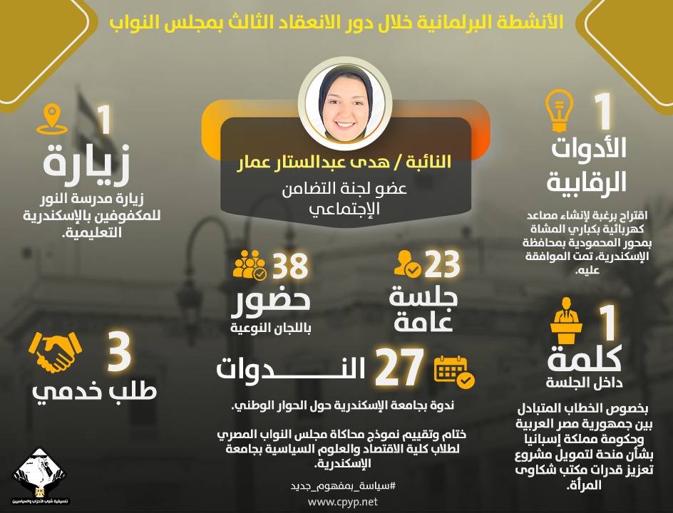 وقامت النائبة، بعدد 1 زيارة وكانت لمدرسة النور للمكفوفين بالإسكندرية التعليمية، وكان للنائبة عدد 27 من الندوات أبرزهم ندوة بجامعة الإسكندرية حول الحوار الوطني، بالإضافة لختام وتقييم نموذج محاكاة مجلس النواب المصري لطلاب كلية الاقتصاد والعلوم السياسية بجامعة الإسكندرية، وكان للنائبة عدد 3 طلب خدمي.