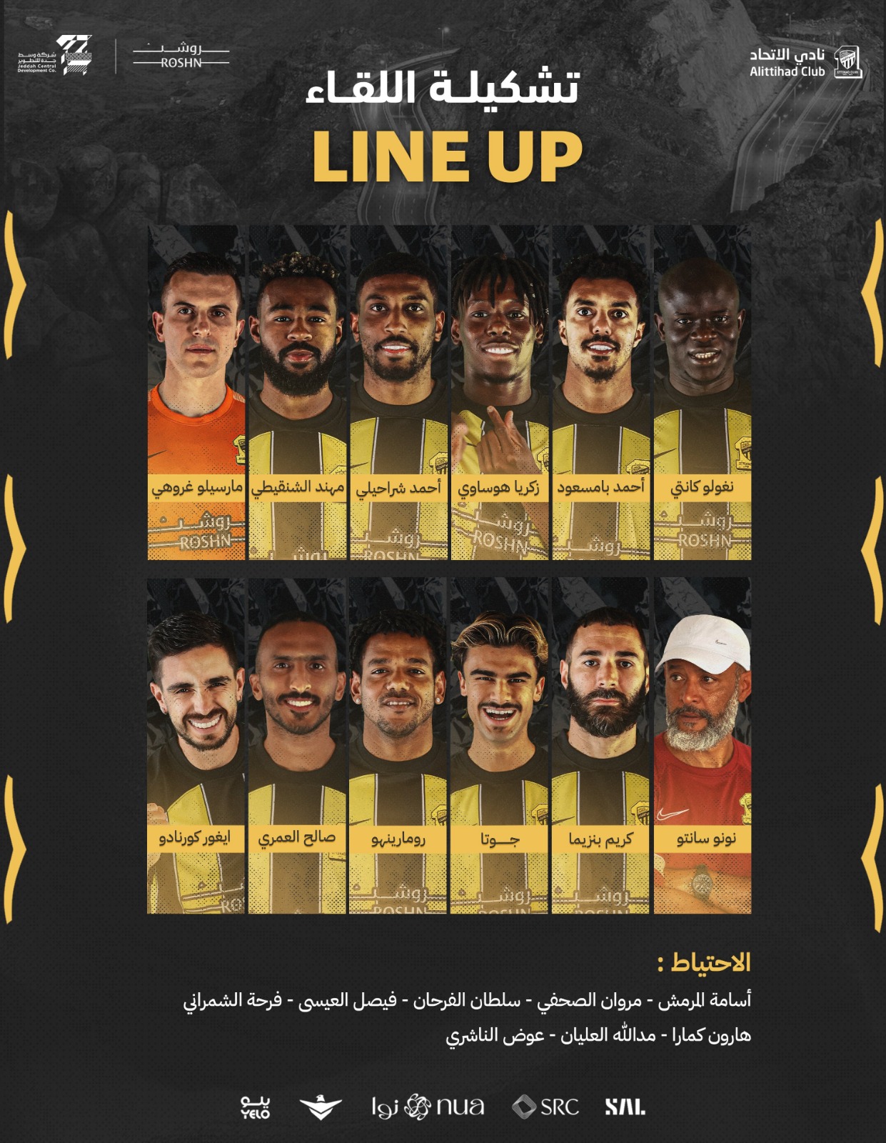 ويقود بنزيما تشكيل فريق اتحاد جدة، خلال لقاء اليوم الذي ينطلق في تمام التاسعة مساء اليوم السبت الموافق 5 من أغسطس الجاري.