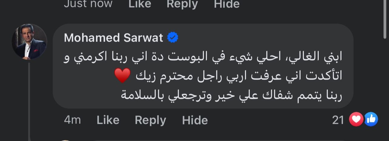 وقال محمد ثروت في تعليقه على منشور نجله أحمد: ابني الغالي، أحلى شي في البوست ده اني ربنا أكرمني واتأكدت إني عرفت أربي راجل محترم زيك، ربنا يتمم شفاك على خير وترجعلي بالسلامة.