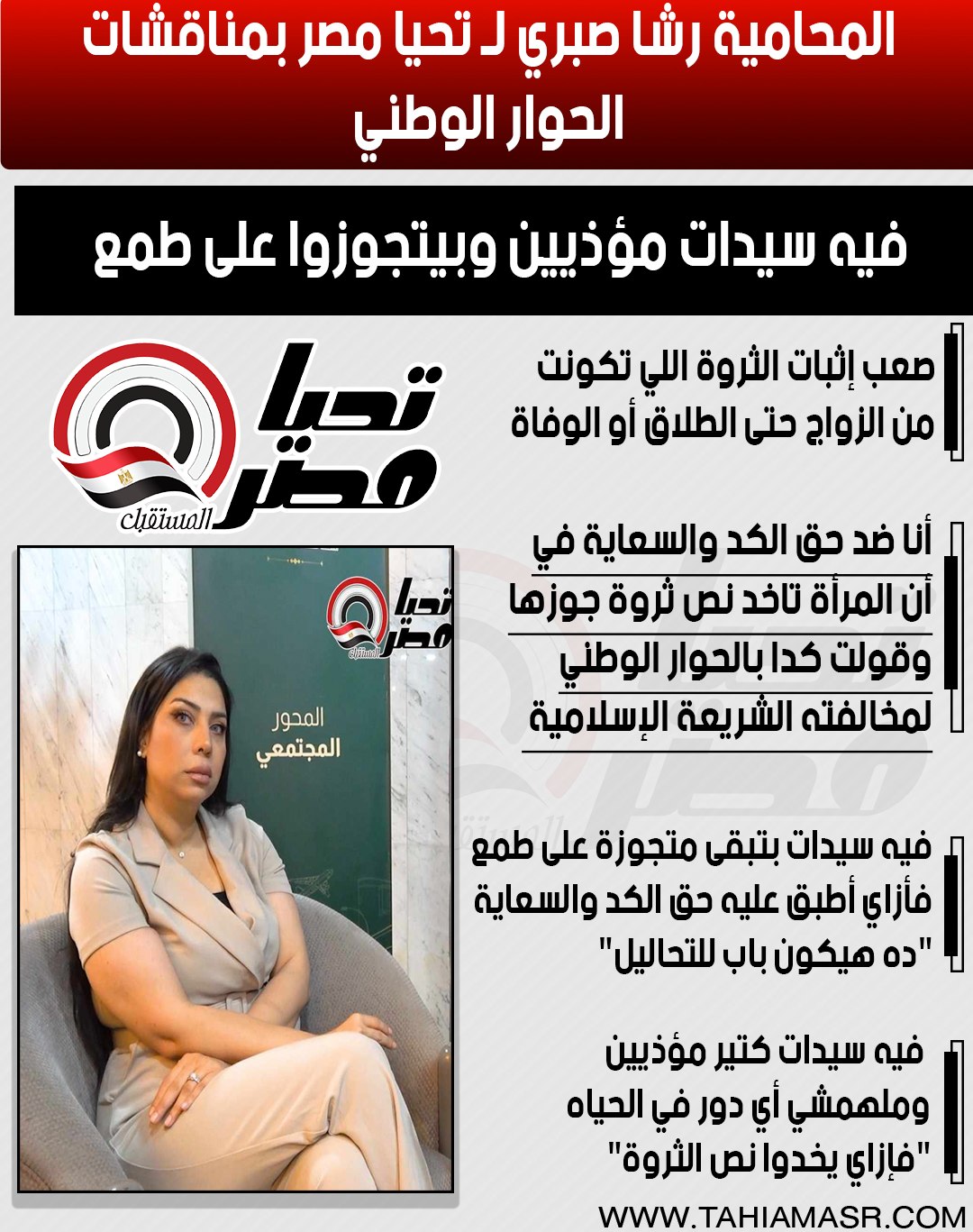 المحامية رشا صبري لـ تحيا مصر:أنا ضد حق الكد والسعاية.. وفيه سيدات كتير مؤذيين وملهمشي أي دور في الحياه «فإزاي يخدوا نص الثروة»