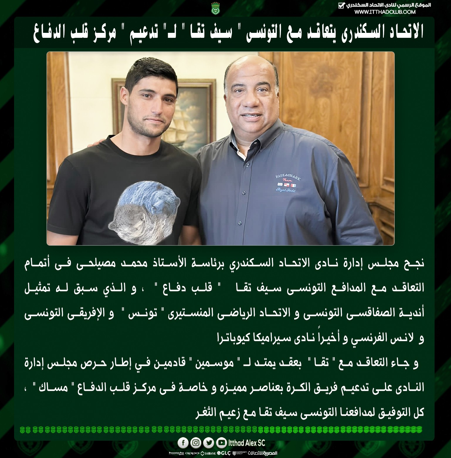 نجح مجلس إدارة نادي الاتحاد السكندري برئاسة الأستاذ محمد مصيلحي في إتمام التعاقد مع المدافع التونسي سيف تقا لاعب نادي سيراميكا كليوباترا السابق.