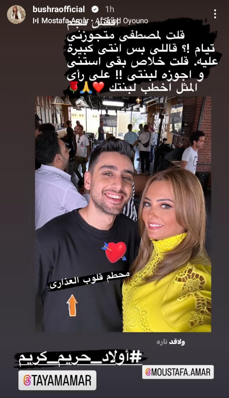 ونشرت بشرى صورة لها رفقة تيام مصطفى قمر خلال خاصية استوري، وعلقت عليها: قولت لمصطفى قمر ماتجوزني تيام قالي بس أنتي كبيرة عليه.. قولت خلاص بقى استنى واجوزه لبنتي.. على رأي المثل أخطب لبنتك.