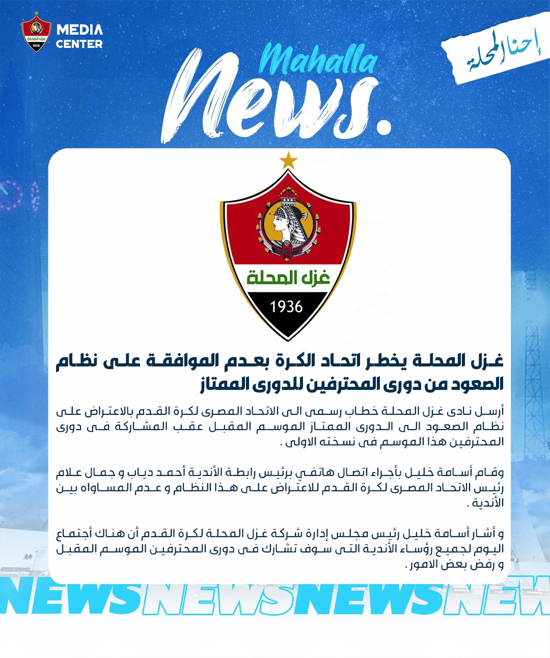 أرسل نادي غزل المحلة خطاب رسمي إلى الاتحاد المصري لكرة القدم بالاعتراض على نظام الصعود إلى الدوري الممتاز الموسم المقبل عقب المشاركة في دوري المحترفين هذا الموسم في نسخته الأولى.