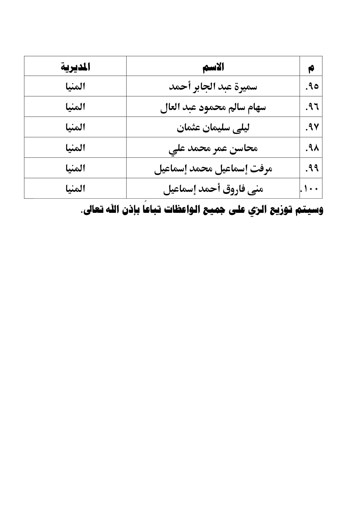 وأوضحت وزارة الأوقاف، أنه سيتم تسليم الزي الجديد لواعظات الأوقاف داخل مبنى الوزارة الجديد بالعاصمة الإدارية، وأسماء الواعظات اللاتي يحق لهن استلام الزي الجديد، هنَّ: