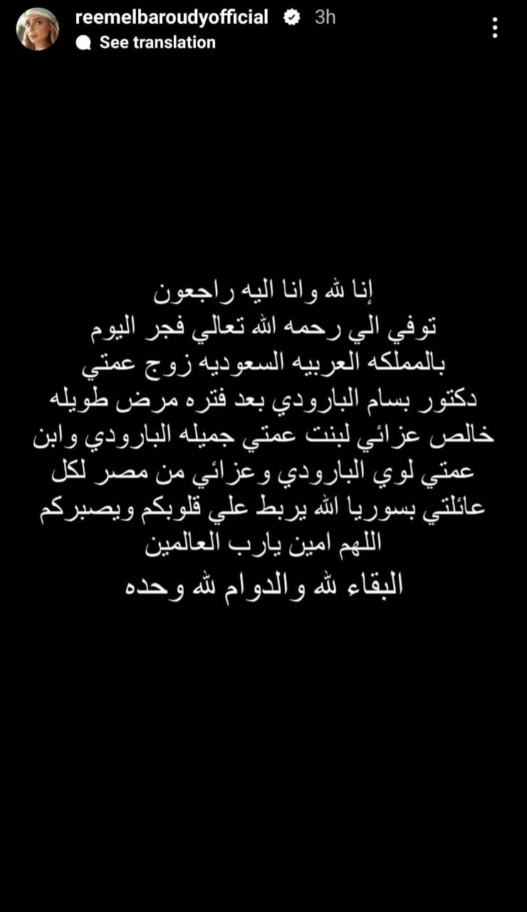 وكتبت ريم البارودي من خلال خاصية استوري: "إنا لله وإنا إليه راجعون، توفى إلى رحمة الله فجر اليوم بالمملكة العربية السعودية زوج عمتي دكتور بسام البارودي بعد فترة مرض طويلة، خالص عزائي لبنت عمتي جميلة البارودي وابن عمتي لؤي البارودي، وعزائي من مصر لكل عائلتي بسوريا، الله يربط على قلوبكم ويصبركم، اللهم أمين يارب العالمين، البقاء لله والدوام لله وحده".