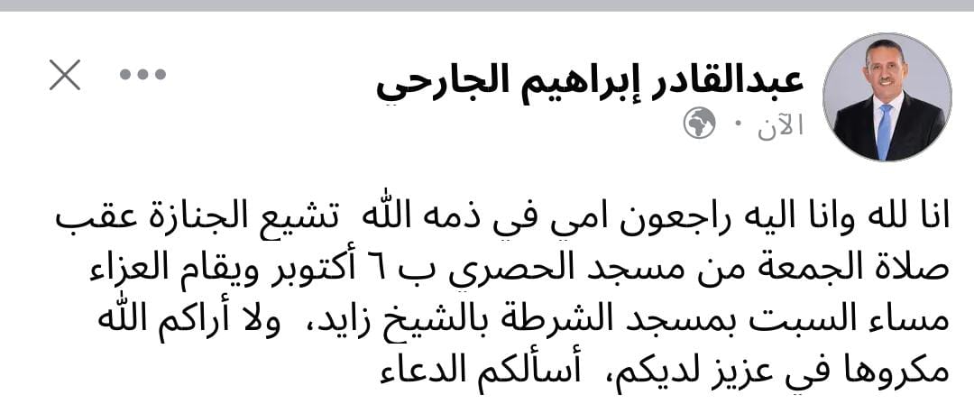 وكتب "الجارحي"، على صفحته الشخصية على فيس بوك: "انا لله وانا اليه راجعون امي في ذمه الله.. تشيع الجنازة عقب صلاة الجمعة من مسجد الحصري ب ٦ أكتوبر".