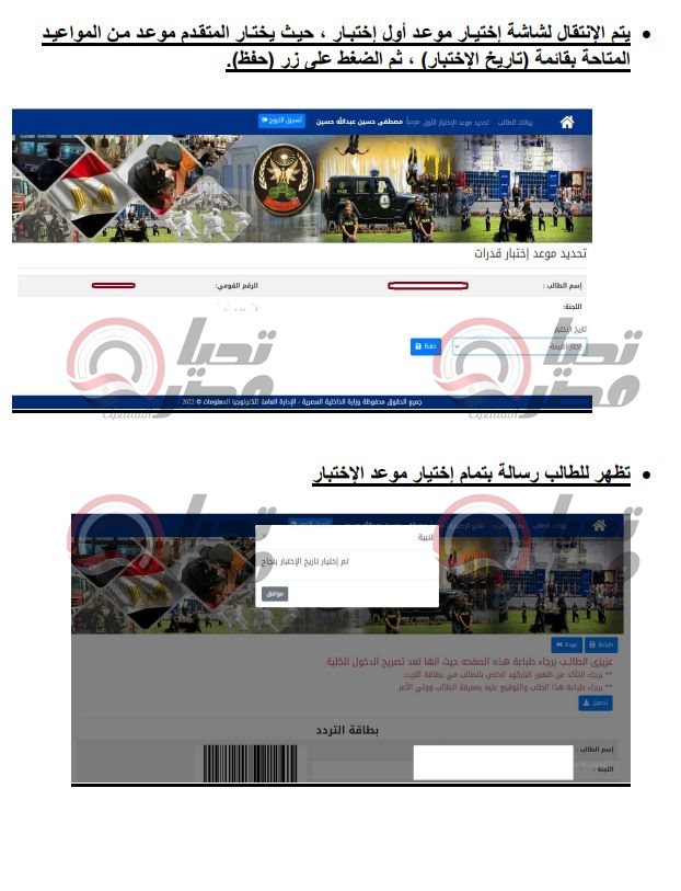 ثم في الخطوة التالية تظهر للطالب قائمة بمواعيد الإختبارات، ثم رسالة بتمام إختيار مواعيد الإختبار، ثم تظهر شاشة بطاقة التردد وبها الباركود الخاص بالمتقدم ويجب على الطالب طباعتها عن طريق الضغط على طباعة، لتحميل الإقرار الخاص بالتقدم والتوقيع عليه بمعرفة الطالب وولي الأمر، ويجب على المتقدم إصطحاب بطاقة التردد والإقرار للكلية في موعد أول إختبار.