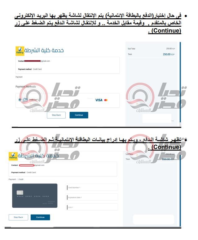 وفي الخطوة السادسة، يتم دفع مقابل الخدمة حيث يتم الضغط على زر الدفع والإختيار بين الدفع بكود فوري أو الدفع بالبطاقة الإئتمانية، وفي حالة اختيار الدفع بكود فوري يظهر للمتقدم كود الدفع الخاص به علما بأن صلاحية الكود 48 ساعة فقط، وفي حالة إختيار الدفع بالبطاقة الإئتمانية يتم الإنتقال لشاشة يظهر بها البريد الإلكتروني الخاص بالمتقدم وقيمة مقابل الخدمة.