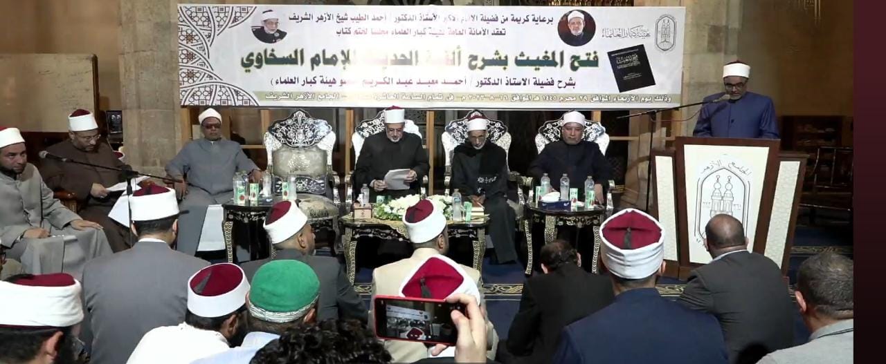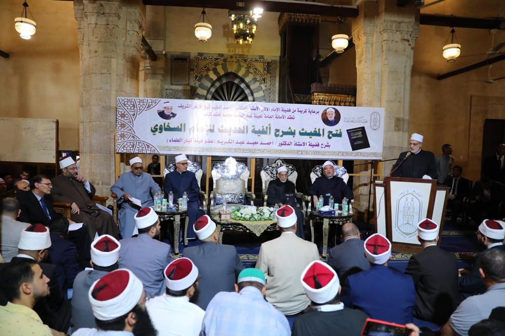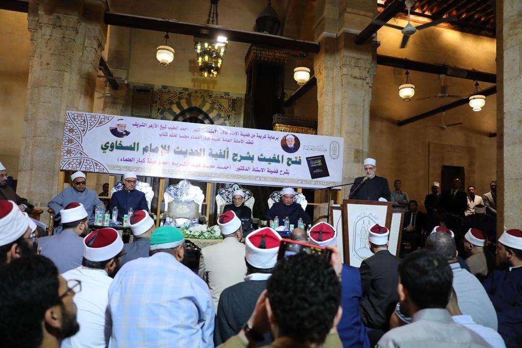 وبيّن وكيل الأزهر أن عقد مجالس ختم كتب العلم -لا سيما الحديث الشريف- سُنة درج عليها العلماء عبر القرون، وقد اشتهرت بصورة واضحة في القرن التاسع الهجري، فقد ألف الإمام ابن الجزري كتابا في ختم مسند الإمام أحمد، وجاء الحافظ ابن ناصر الدين فألف ختما على صحيحي البخاري ومسلم، كما أن الإمام السخاوي الذي نحتفي بختم كتابه اليوم قد شارك في هذا النوع من التصنيف، فألف ثلاثة عشر كتابا في هذا الباب، مضيفا أننا إذ نقيم هذا الختم المبارك في الجامع الأزهر الشريف؛ فإنما نفعل ذلك وفاء وعرفانا لما قام به هذا الإمام النبيل من جهود حثيثة في هذا الباب، وإحياء لهذه العادة العلمية الكريمة.