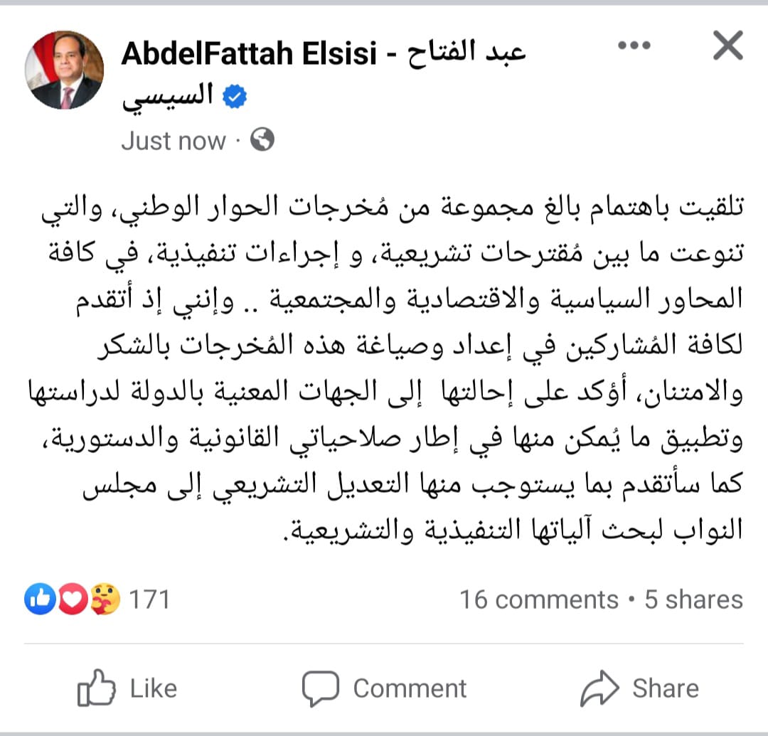 قال الرئيس عبد الفتاح السيسي، إنه تلقى باهتمام بالغ مجموعة من مُخرجات الحوار الوطني، والتي تنوعت ما بين مُقترحات تشريعية، و إجراءات تنفيذية، في كافة المحاور السياسية والاقتصادية والمجتمعية.