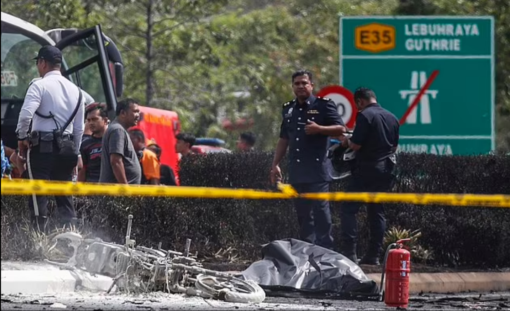 لحظة مرعبة تحطمت فيها طائرة خاصة كانت تحلق من جزيرة عطلة فاخرة وإنفجرت متحولة لكرة نارية ضخمة على طريق ماليزي مزدحم، مما أسفر عن مقتل عشرة أشخاص.