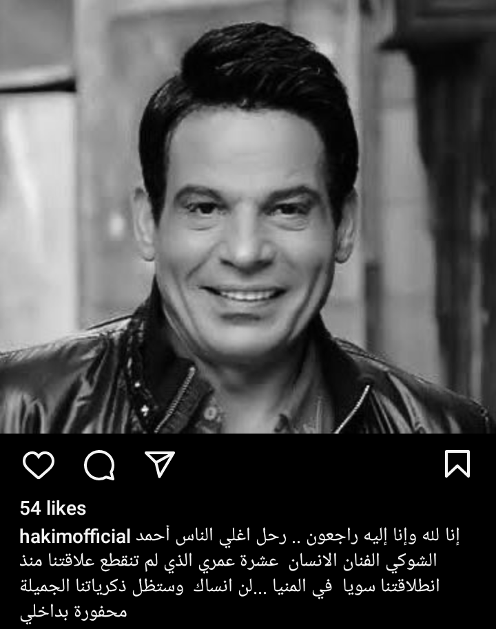 حرص المطرب حكيم على نعي صديقه الفنان أحمد الشوكي صاحب أغنية "أعملك اي"، وذلك من خلال حسابه الرسمي بموقع التواصل الاجتماعي انستجرام، موجها له رسالة مؤثرة.
