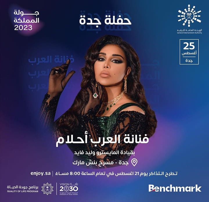 وتحيى أحلام حفلها في جدة على مسرح بنش مارك بقيادة المايسترو وليد فايد، ومن المقرر طرح تذاكر الحفل غدا 21 أغسطس.