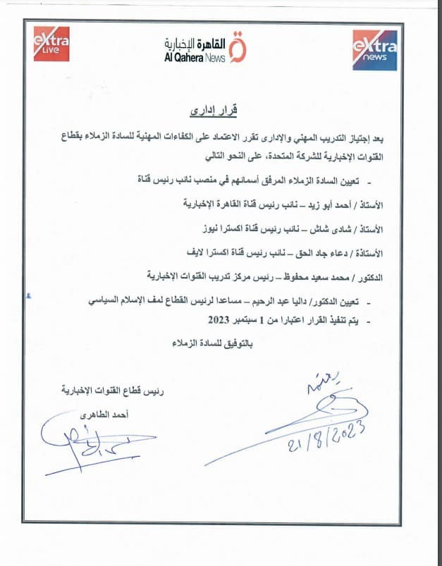 - تعيين أحمد الطاهري : رئيسا لقطاع القنوات الإخبارية.