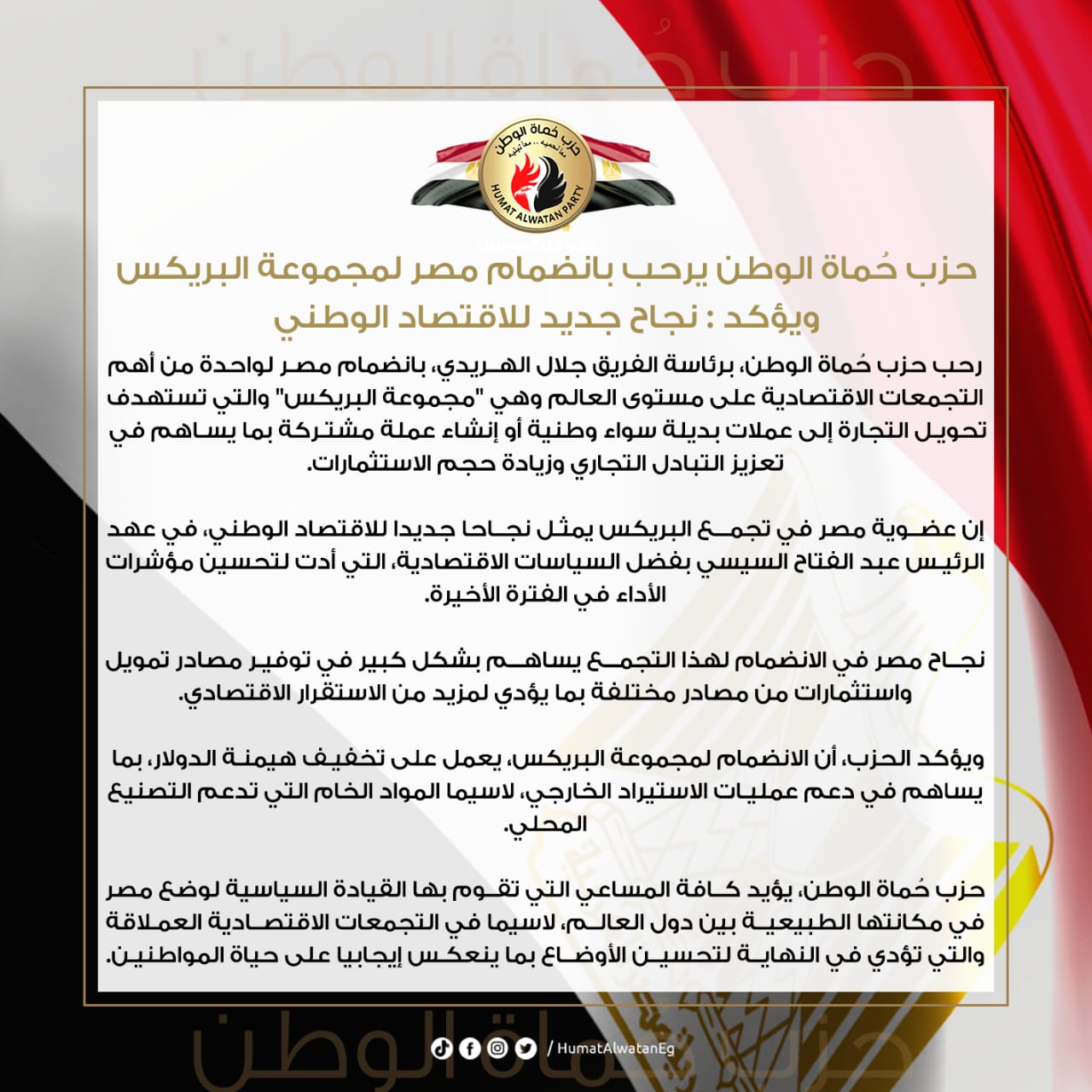 حزب حماة الوطن يرحب بانضمام مصر لمجموعة البريكس.. ويؤكد: نجاح جديد للاقتصاد الوطني