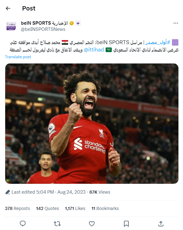 ونشرت شبكة قنوات بي إن سبورتس عبر صفحتها الرسمية على تويتر: «النجم المصري محمد صلاح أبدى موافقته على عرض الانضمام لنادي الاتحاد السعودي.. ويبقى الاتفاق مع نادي ليفربول لحسم الصفقة».