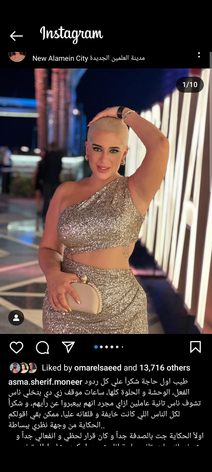 وكتبت اسما شريف منير عبر حسابها الرسمي بموقع تبادل الصور والفيديوهات انستجرام: طيب اول حاجة شكراً علي كل ردود الفعل، الوحشة و الحلوة كلها، ساعات موقف زي دي بتخلي ناس تشوف ناس تانية عاملين ازاي مجرد انهم بيعبروا عن رأيهم، و شكراً لكل الناس اللي كانت خايفة و قلقانه عليا، ممكن بقي اقولكم الحكاية من وجهة نظري ببساطة.