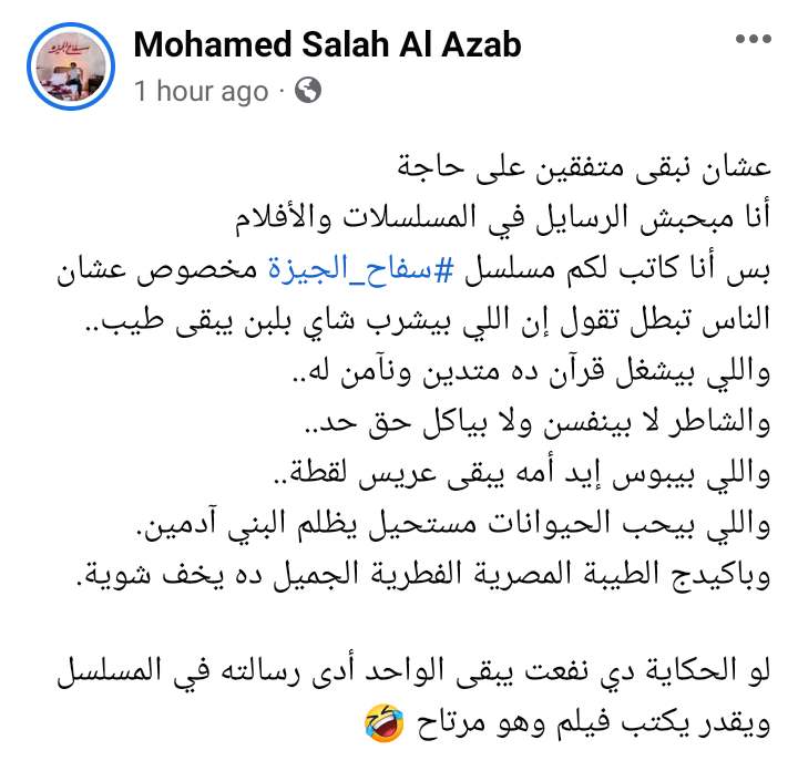 وقال محمد صلاح العزب عبر موقع التواصل الإجتماعي “فيسبوك”: عشان نبقى متفقين على حاجة أنا مبحبش الرسايل في المسلسلات والأفلام بس أنا كاتب لكم مسلسل سفاح الجيزة مخصوص عشان الناس تبطل تقول إن اللي بيشرب شاي بلبن يبقى طيب.. واللي بيشغل قرآن ده متدين ونآمن له.. والشاطر لا بينفسن ولا بياكل حق حد.. واللي بيبوس إيد أمه يبقى عريس لقطة.. واللي بيحب الحيوانات مستحيل يظلم البني آدمين.،وباكيدج الطيبة المصرية الفطرية الجميل ده يخف شوية.