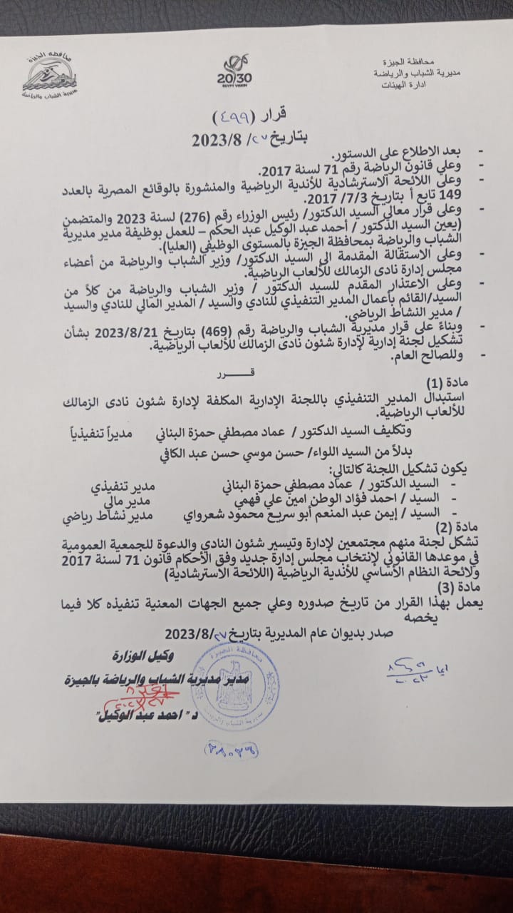 وأضاف: "وبناء على ما تقدم، فمن المقرر أن يتم تكليف مدير تنفيذي ومدير مالي ومدير النشاط الرياضي وتشكيل لجنة منهم مجتمعين لتسيير شؤون النادي إلى حين أقرب جمعية عمومية خلال الأشهر القليلة المقبلة والمتضمنة ضمن جدول أعمالها بنداً لانتخاب مجلس إدارة لنادى الزمالك لدورة انتخابية جديدة.