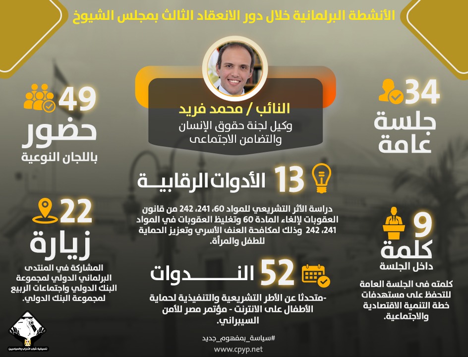 ننشر النشاط البرلماني لنائب التنسيقية محمد فريد خلال دور الانعقاد الثالث لمجلس الشيوخ