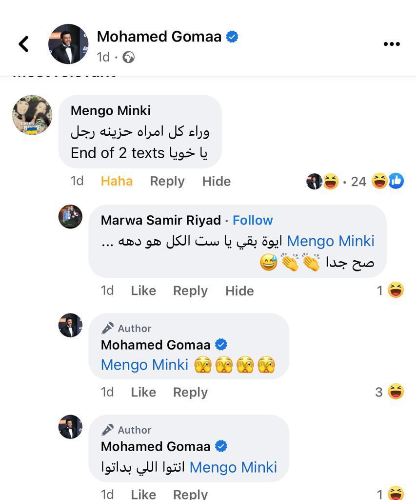 من ضمن تلك التعليقات هو تعليق النجمة منة شلبي على صفحة النجم محمد جمعة بعد مشاركته في حفل ليلة الدموع بشخصية الشهيرة "عم ضياء"، ليعلق بعدها جمعة على منشور شاركه الجمهور قائلًا: لما يحبوا يعملوا حفل ليلة الدموع جابوا الحفلة كلها رجالة"، ليرد جمعة قائلا؛ “ ورا كل رجل حزين أمرآة end of life”.