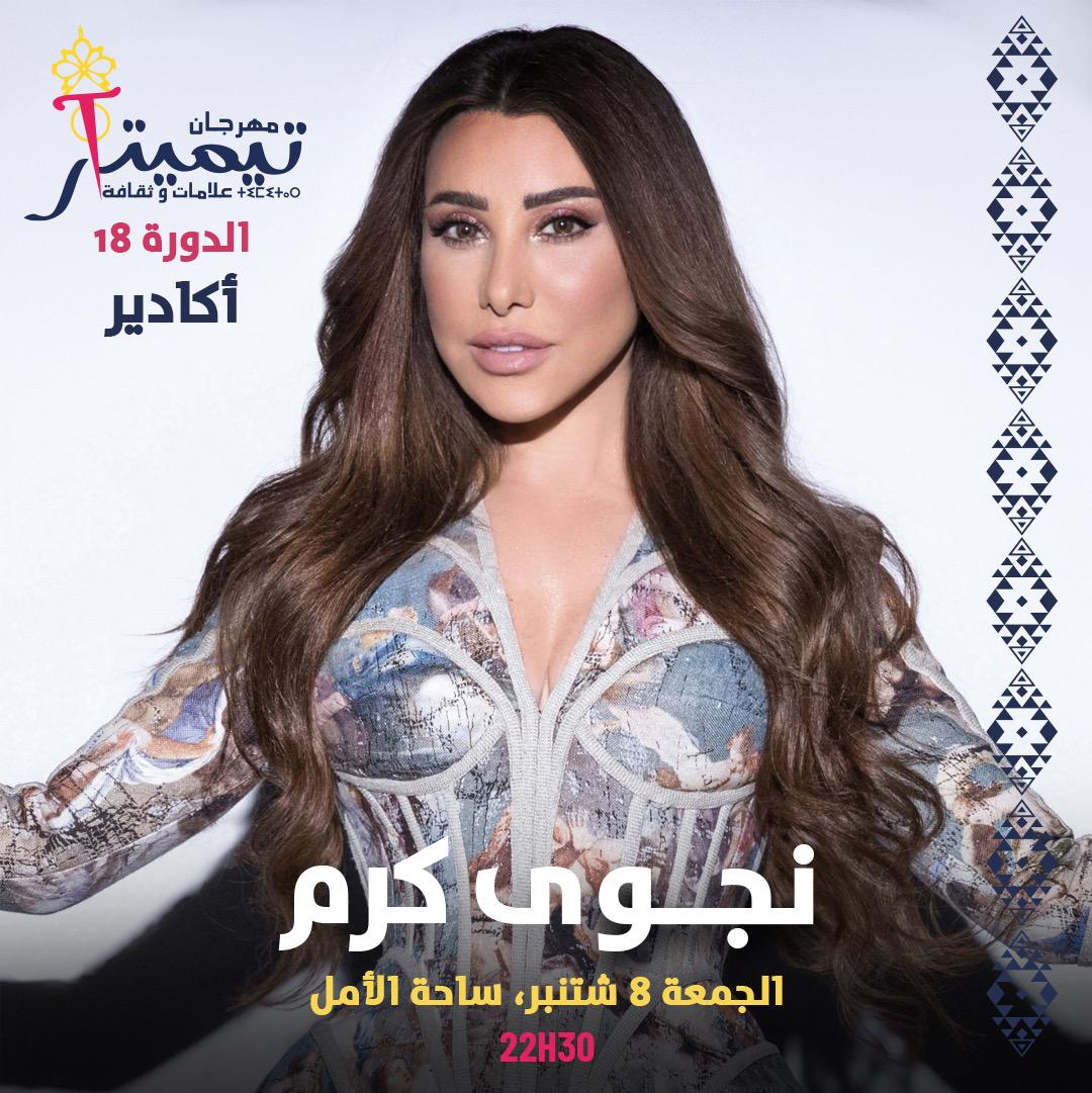 أعلنت شمس الأغنية العربية، الفنانة اللبنانية نجوى كرم عبر حساباتها المختلفة في منصات التواصل الإجتماعي، عن موعد إحيائها للحفل الغنائي في مهرجان تيميتار 2023 في مدينة أكادير بالمملكة المغربية، وذلك يوم 8 سبتمبر 2023 في ساحة الأمل.