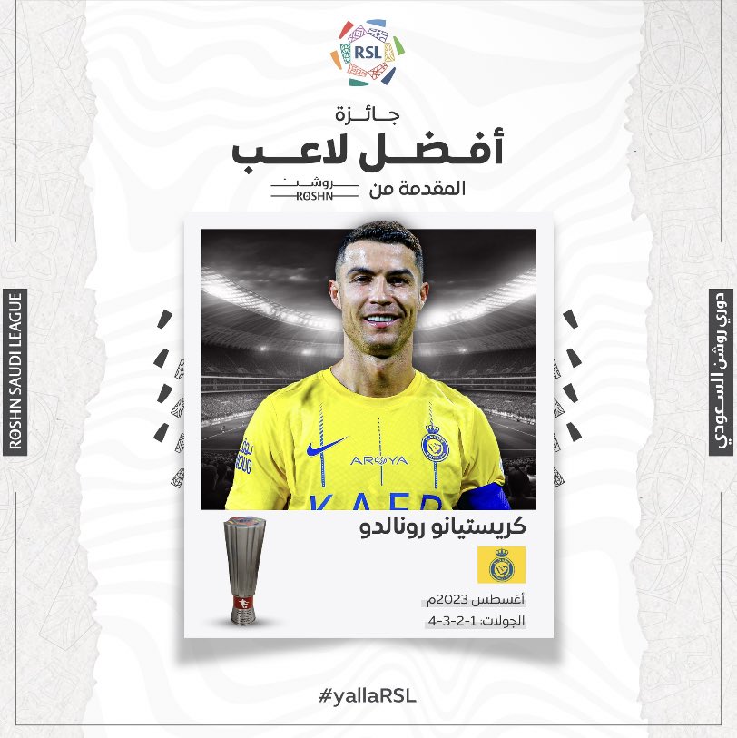 وقد حصل البرتغالي كريستيانو رونالدو مهاجم نادي النصر على جائزة أفضل لاعب في شهر أغسطس ضمن منافسات الدوري السعودي، بعد أن تصدر قائمة هدافو الدوري حيث سجل 5 أهداف وصنع هدفين، خلال ثلاث مباريات فقط.