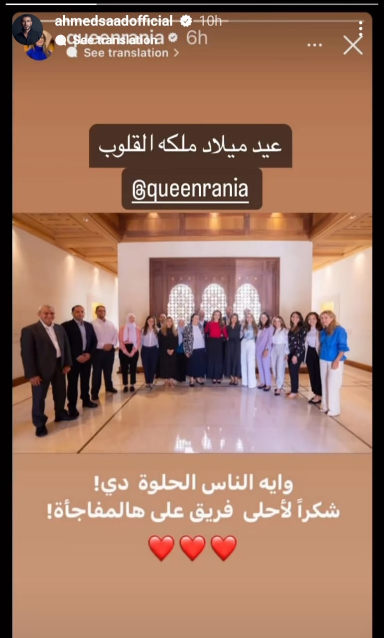 حيث شارك صورة للملكة رانيا رفقة عدة أشخاص عبر خاصية استوري، على أنغام أغنية ايه اليوم الحلو دا، وعلق عليها قائلًا: "عيد ميلاد ملكة القلوب"، وذلك يعتبر هو الظهور الأول لأحمد سعد بعد إعلان طلاقه من زوجته علياء البسيوني.