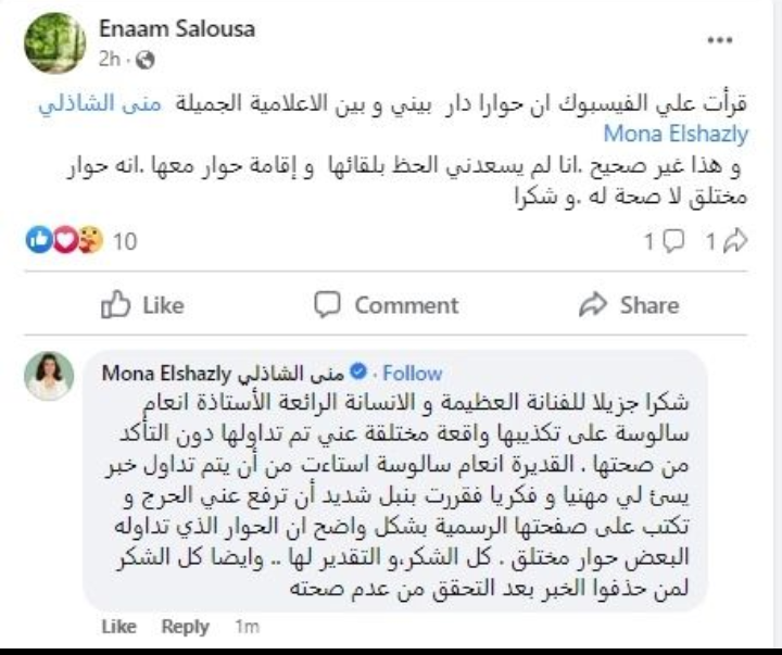 وردت عليها منى الشاذلي، وقالت: شكرا جزيلا للفنانة العظيمة و الانسانة الرائعة الأستاذة انعام سالوسة على تكذيبها واقعة مختلقة عني تم تداولها دون التأكد من صحتها . القديرة انعام سالوسة استاءت من أن يتم تداول خبر يسئ لي مهنيا و فكريا فقررت بنبل شديد أن ترفع عني الحرج و تكتب على صفحتها الرسمية بشكل واضح ان الحوار الذي تداوله البعض حوار مختلق . كل الشكر،و التقدير لها .. وايضا كل الشكر لمن حذفوا الخبر بعد التحقق من عدم صحته.