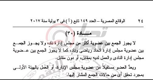 وتنص المادة 30 من اللائحة الاسترشادية التي ستقام عليها انتخابات نادي الزمالك بأنه لا يجوز الجمع بين عضوية أكثر من مجلس إدارة ناد ولا يجوز الجمع بين عضوية مجلس إدارة اتحاد رياضي وناد، كما لا يجوز الجمع بين عضوية مجلس ادارة النادي والعمل لدية بمقابل أو دون مقابل،، ويعد العضو مستقيلا من عضوية مجلس الادارة أو العمل بالهيئة الأولى بمجرد تحقق أي من حالات الجمع المشار اليها".